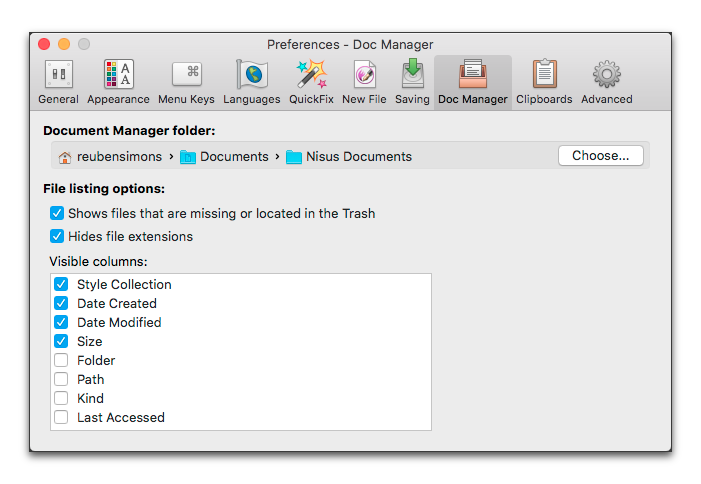 1. Choose the menu command: Nisus Writer Express > Preferences > Doc Manager at the top of the Preferences window.