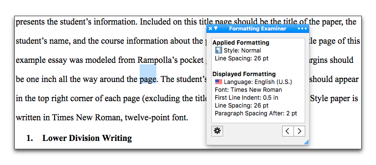 Other adjustments may also be at work for the Displayed Formatting portion of the Formatting Examiner. First off there’s the obvious: manually applied formatting (aside from styles) such as the Line Spacing set to 26 points in Figure 304. But there are other possibilities like font substitution (explained on page 100), that is, if the applied or enforced font cannot display the text and another backup font is chosen.