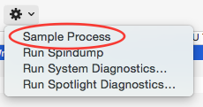 4. Quickly switch back to Activity Monitor, click the toolbar item with a gear icon, and choose Sample Process from the popup menu: