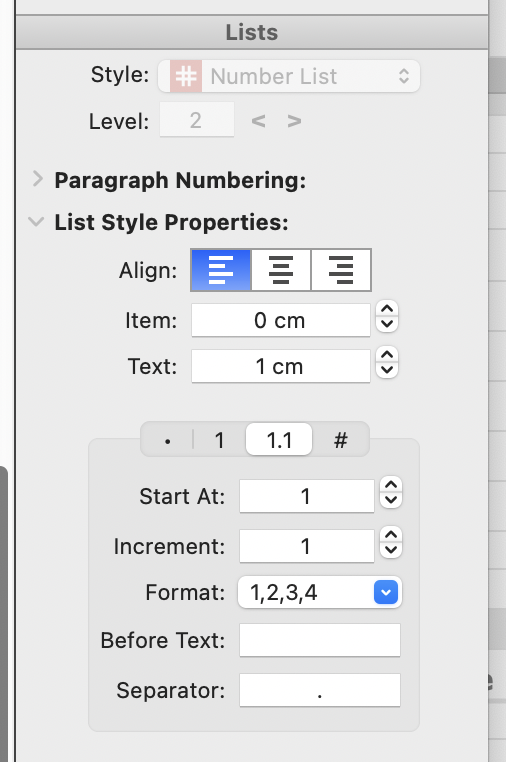In the list style properties, go to “• 1 1.1 #” and select the # option. I believe this will allow you to format the levels in detail.