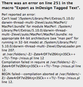 Q1) I just tried to use the "Export to InDesign as Tagged Text" macro from 2009 (http://nisus.com/pro/macros/?activeCat=Misc), and I get this error message related to Perl (see screenshot).