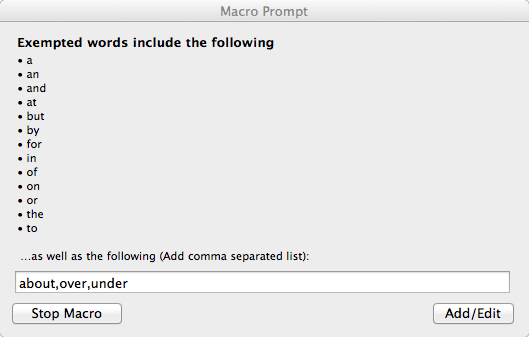 But most likely you don't need to change the macro. One of the two macros is for adjusting the list of words you want exempted from being capitalized. You can adjust that list anytime--by running the relevant macro--and that list will be active from that point on forward. This whole approach to Title Case is far from perfect. Hopefully Nisus Writer will have a more properly built-in Title Case feature someday soon.