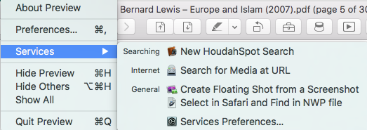 The Use Selection for Find command (with Cmd+E shortcut) is also available in Preview, albeit with a peculiarity. You can select a single word in a Preview document, invoke the command, then copy the contents of the Preview Find field and paste them into a Nisus Writer document. You can also copy the original selection in the body of the Preview document and paste it into a Nisus Writer document. The results are not always the same! In some cases, the second procedure can transfer unsuspected trailing characters (eg, space plus paragraph return) along with the text of interest. However, the Use Selection for Find command seems to have stripped them from the text it displays in the Preview Find field. This is probably a peculiarity of the document I had before me (which was a sort of bilingual dictionary), but such behavior has consequences for the design of a more universally applicable text-finding Service.