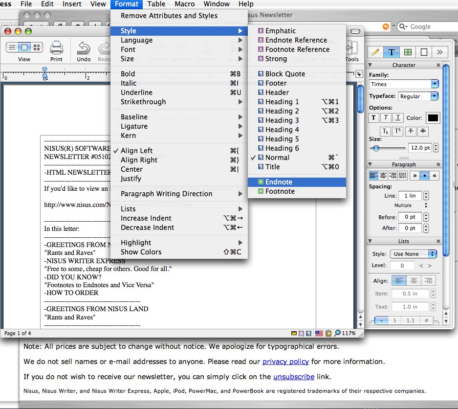 Nisus, Nisus Writer, and Nisus Writer Express, Apple, iPod, PowerMac, and PowerBook are registered trademarks of their respective companies.