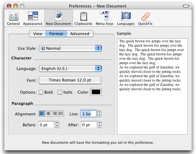 Let me give you an example. Express has Times at 12 point with line spacing at 1 inch and after paragraph spacing at 6 pt. You want to change those settings to Zapf Dingbats at 18 pt, line spacing at zero, with the alignment at center. Why? Because you are odd. You change this by choosing "Preferences" from the "Nisus Writer Express" menu and clicking on "New Document". Click on the "Format" tab.