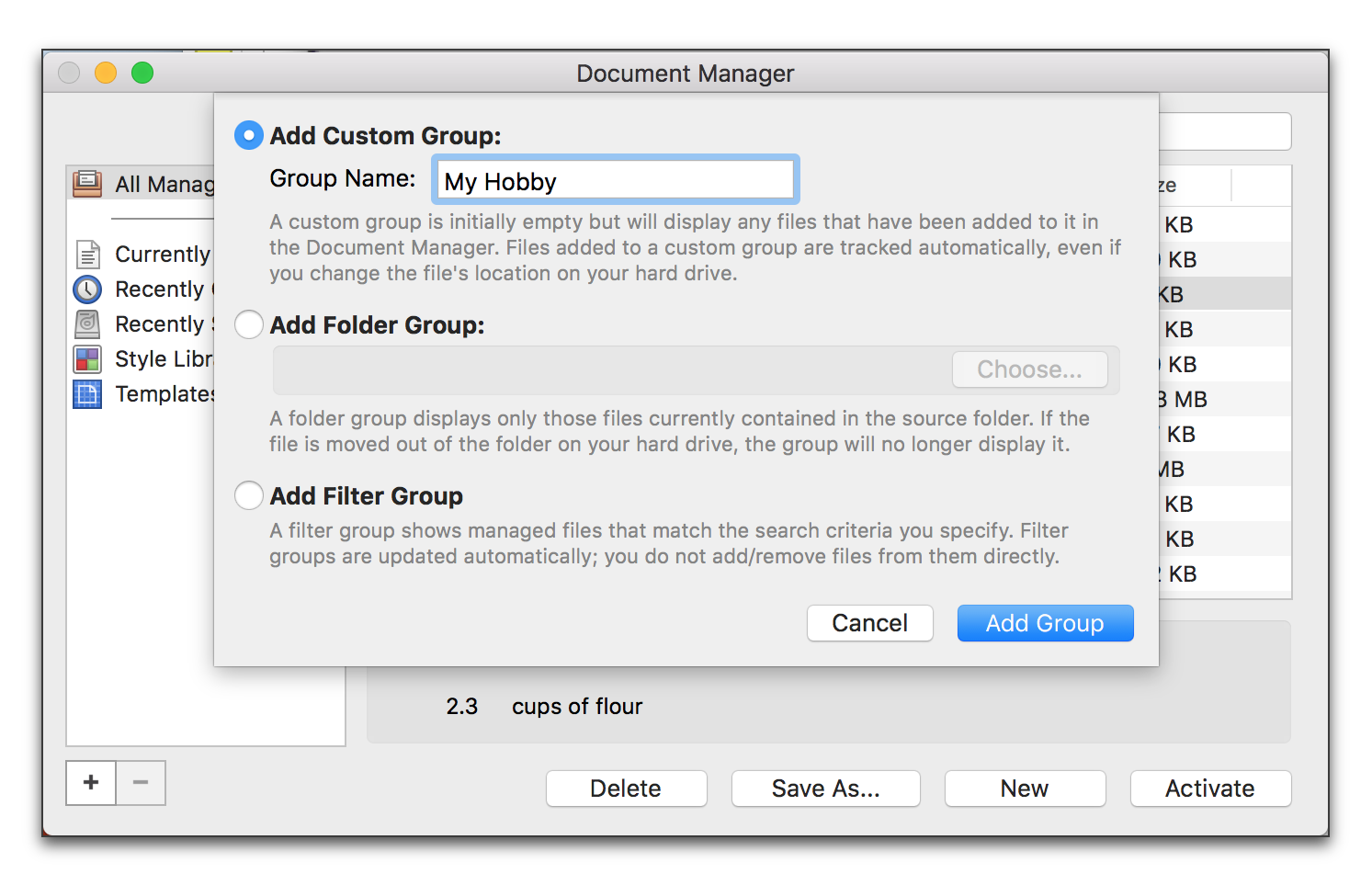 You may have a special hobby with various files associated with it scattered around your hard drive, or collected in the All Managed Files group of the Document Manager. Perhaps you are an amateur chef. You have recipes in one folder, lists of and receipts for tools you have or wish to purchase in another folder, locations of farmers’ markets within a 20 mile radius of your home in a third folder. These folders and their files might even be on different hard drives or with the recipes saved in the computer’s shared folder so various users have access to them. Or, you may have files spread throughout your hard drive that deal with various correspondence, but each has a hint that it is a “letter”. The Document Manager can help you keep these “together”.