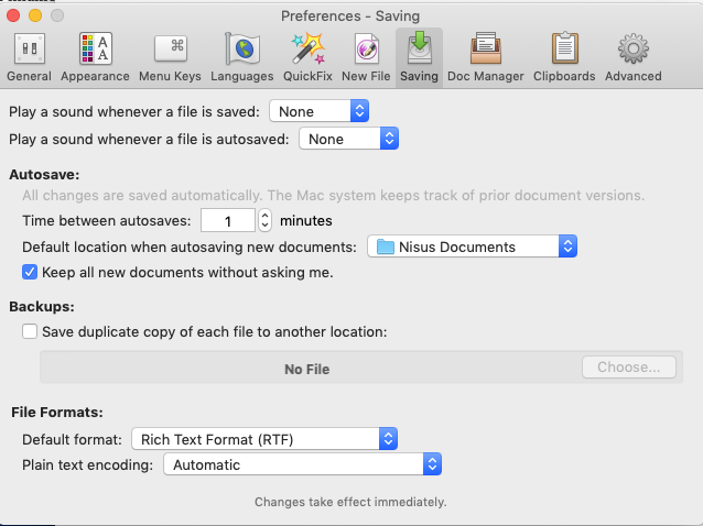 Lately when I try to save new files (that have not already autosaved into the Nisus folder) I can create a file, but when Nisus Writer Pro (3.0.4) tries to autosave, I get an error message "Allow save to discard document formatting?", as shown in the attached screen shot. https://nisus.com/forum/download/file.p ... id=2054The default file type is set as an RTF, yet it seems to be trying to default to a text format. I am also attaching screen shots of the Saving https://nisus.com/forum/download/file.p ... id=2052and New File Preferences https://nisus.com/forum/download/file.p ... 053because this little big may be related to one of them. [attachment=0]Autosave wants to discard formatting.png[/attachment]