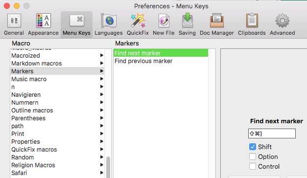 6. Repeat with "Find previous marker" and assign the default shortcut from Mellel (Cmd + Ctrl + [)
