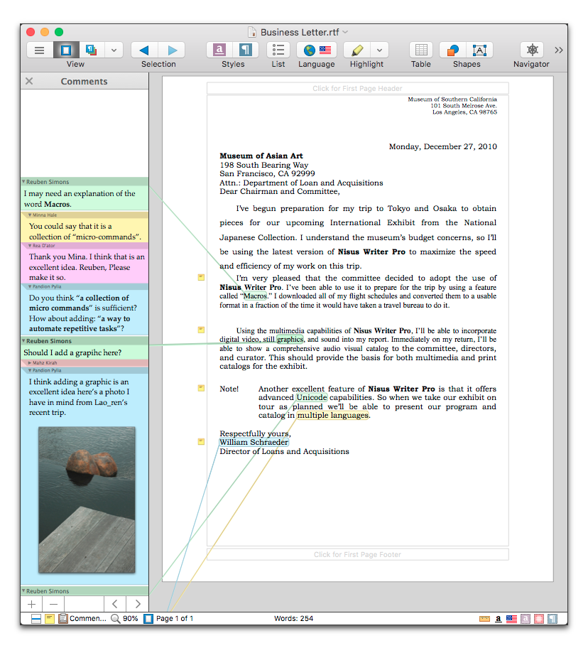 You can leave comment highlighting on in the text and keep the Comments sidebar closed. This enables you to see where comments appear in your text without the distraction of seeing the comments themselves. As illustrated in Figure 443 the words “Unicode” “multiple languages” and “William Schraeder” are faintly highlighted in both green, yellow and blue respectively. The Business Letter was open on Minna Hale’s computer; the green represents a comment that had been initiated by Reuben Simons, the blue by Pandion Pylia, and the yellow by Minna.