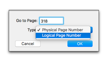 ☞ If you have multiple sections in your document or you have begun your page number counting at something other than 1, you can choose to Show Logical Page Numbers instead Show Physical Page Numbers from the pop-up menu that appears. “Logical” refers to the page number as it would appear on the printed document, whereas “Physical” refers to the actual physical number of pages from the beginning of the document.