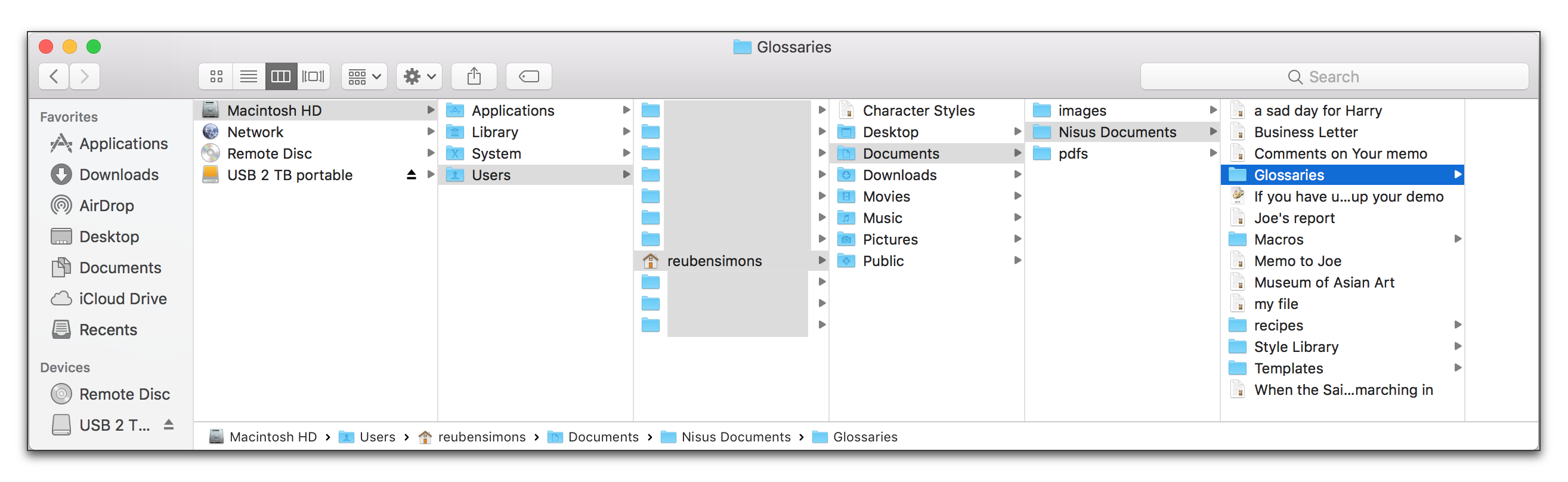 Glossary abbreviations and expansions are stored in a special file on your hard drive located in the Glossaries folder of the Nisus Documents folder inside your Documents folder: