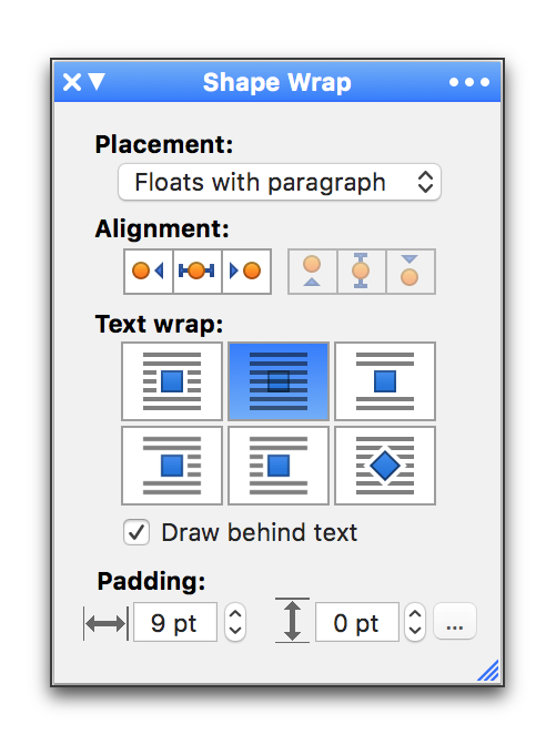 While you can set the basic alignment of an image using the buttons of the Shape Wrap palette, as soon as you adjust the image by nudging it using the arrow keys or drag it using the mouse or trackpad, the Alignment buttons indicate that it is no longer considered “set” as far as the Alignment buttons are concerned.