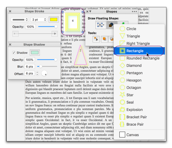 ☞ Nisus Writer Pro also lets you insert a “Canvas”, a fourth kind of shape, which enables you to work on a number of shapes together.